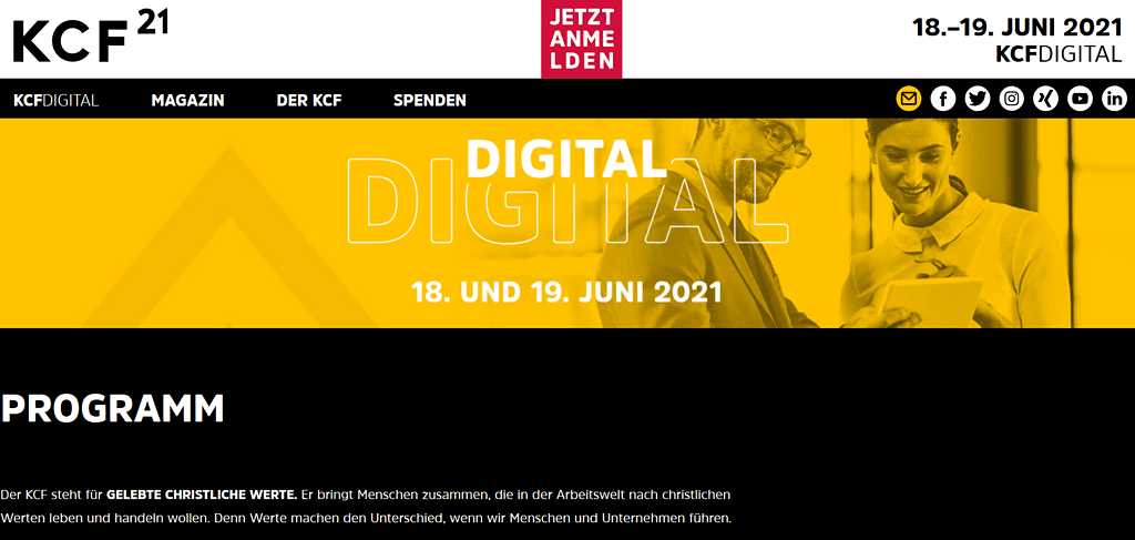 Am 18. Juni startet der zweitägige Kongress Christlicher Führungskräfte (KCF). Er findet wegen der Corona-Pandemie digital statt. Über 2.300 Teilnehmer haben sich bereits registriert, um kostenlos daran teilzunehmen. Veranstalter ist die Evangelische Nachrichtenagentur IDEA. „Das große Interesse zeigt, wie wichtig das Thema ,Christliche Werte‘ gerade in dieser schwierigen Zeit ist“, erklärte der Kongress-Vorsitzende Martin Scheuermann.