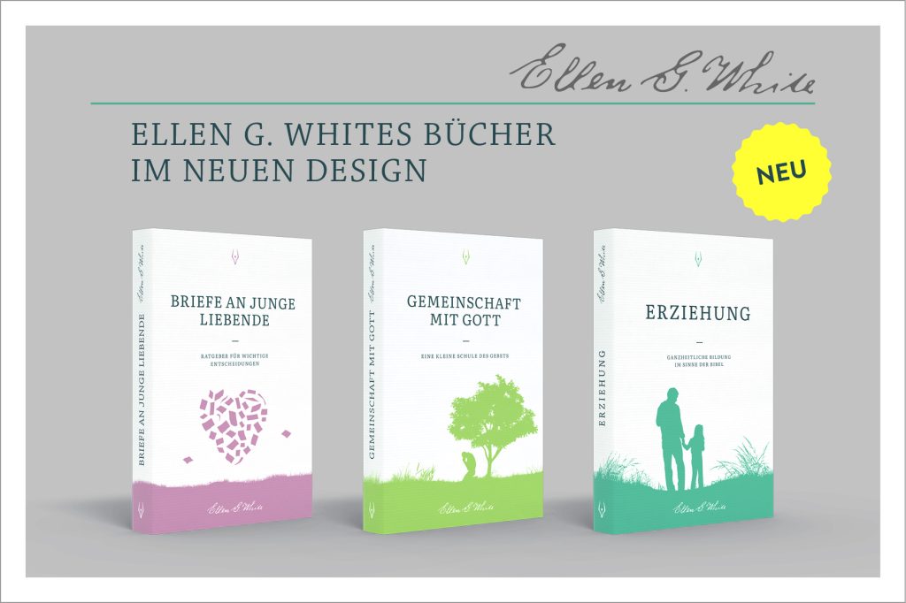 Drei Verlage – ein einheitliches Design. Die Bücher von Ellen G. White sind gemeinsam von den drei offiziellen deutschsprachigen adventistischen Verlagen im Design überarbeitet worden, um dem wertvollen Inhalt der Bücher in Deutschland, Österreich und der Schweiz ein zeitgemäßes und vor allem einheitliches Design zu geben. Die neue Ellen G. White-Linie soll aber nicht nur im Erscheinungsbild, sondern auch inhaltlich ein klares Profil haben. Übersetzungen sollen keine Auslassungen haben und möglichst nahe am Originaltext sein und bekannte Qualitätsmängel sollen ebenfalls vor Veröffentlichung behoben werden. Die ersten Bücher der neuen Linie sind bereits erhältlich: Briefe an junge Liebende (TOP LIFE Wegweiser-Verlag), Gemeinschaft mit Gott (Advent-Verlag Schweiz) und Erziehung (Advent-Verlag Lüneburg).