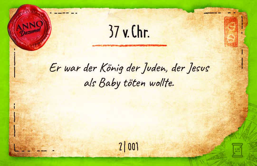 Wann lebte Methusalem und wie alt wurde er? Welche Tiere suchten Ägypten während der 2. Plage heim? Wann wird der König Eglon erstochen, und warum wird ein Hausgötze in Davids Bett gelegt? Was war zuerst: die schwimmende Axt oder die rückwärts laufende Sonnenuhr? Wann wurde festgelegt, welche Schriften zum Neuen Testament gehören sollen, wer oder was sind die Lapsi und was hat es mit der glagolitischen Schrift auf sich? Wer ANNO Dazumal spielt, weiß nach dem Spiel definitiv mehr als vorher!