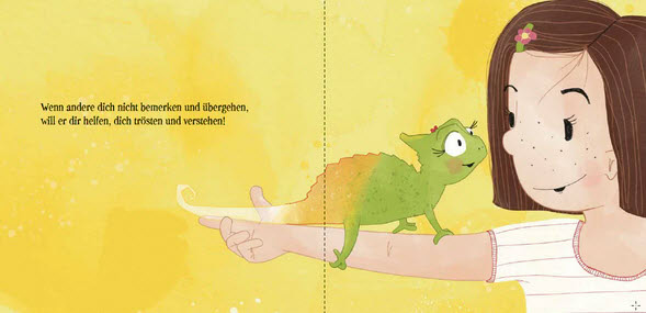 Chamäleon Karlotta wird übersehen. Am Eisstand, am Straßenrand, unter vielen Menschen. Sie testet alles, um sichtbar zu werden: rufen, heulen, ganz laut brüllen, boxen oder brav sein. Bis sie erkennt, dass da jemand ist, der sie sieht. Immer!