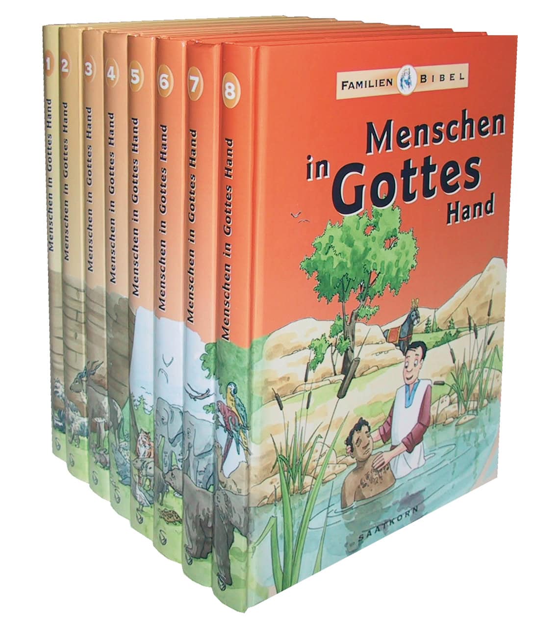 In den acht Bänden dieser Familienbibel werden auf mehr als 1.500 Seiten die Geschichten der Bibel in moderner Sprache nacherzählt.